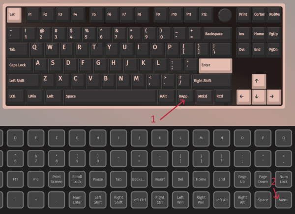 Таким образом, если нас интересует ремап клавиш Windows - переключаемся на Layer 2. Выбираем клавишу на экранной клавиатуре, а затем отмечаем желаемую клавишу для ремапа. Пример, в котором заменяем клавишу правого Win на клавишу контекстного меню.