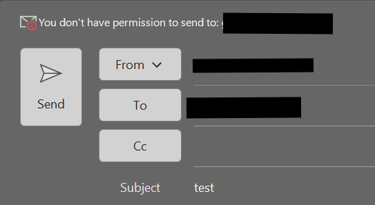 Попытка отправки на такой ящик от имени аккаунта, у которого нет прав будет выглядеть в Outlook следующим образом: