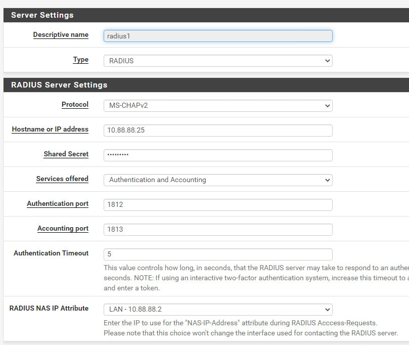 21. Добавим наш RADIUS-сервер на pfSense, который мы только что сконфигурировали в качестве клиента как показано на скриншоте.