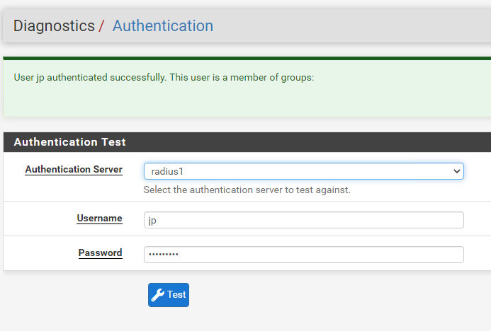 22. Проверим аутентификацию через добавленный RADIUS прямо с pfSense, чтобы убедиться в том, что всё сделано верно.
